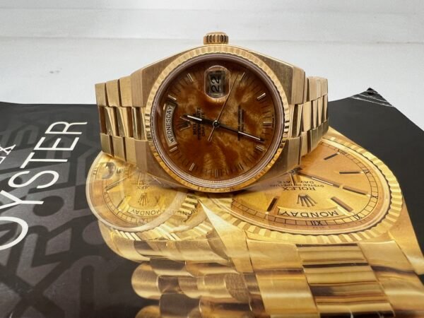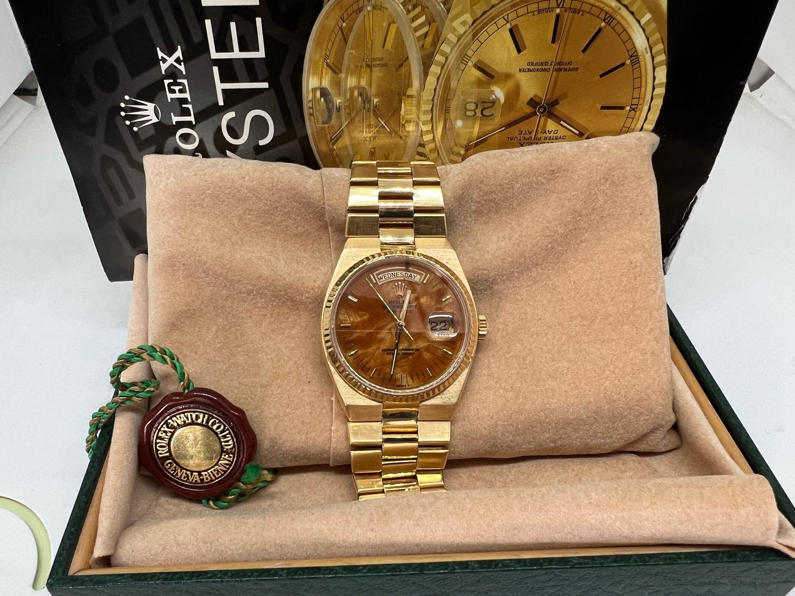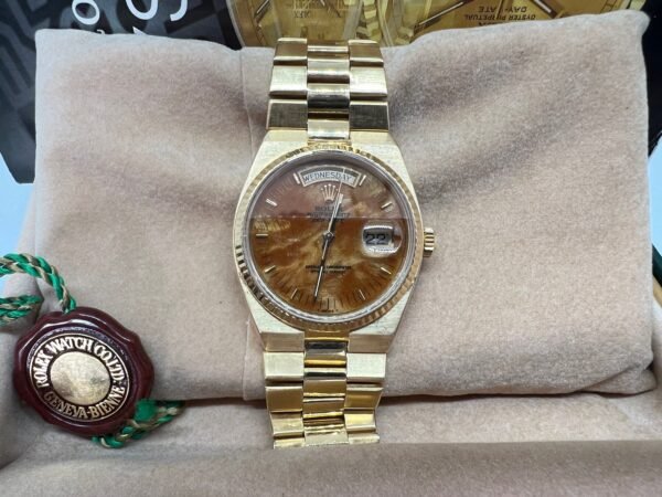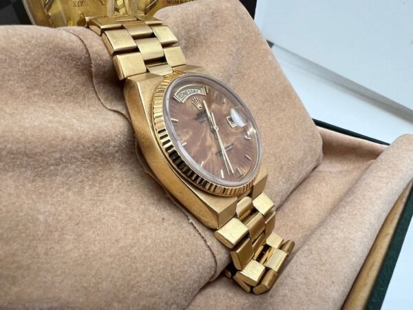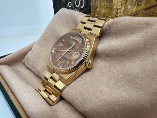 ROLEX DAY DATE OYSTERQUARTZ REFERENCIA 19018 CON UN IMPRESIONANTE Y MUY BUSCADO ENTRE LOS COLECCIONISTAS  DIAL WOOD,ORO 18K,SERIAL 625XXX MILLONES AÑO 1980,UN AÑO DE GARANTIA TIMEGOLF SOBRE LA MAQUINARIA.